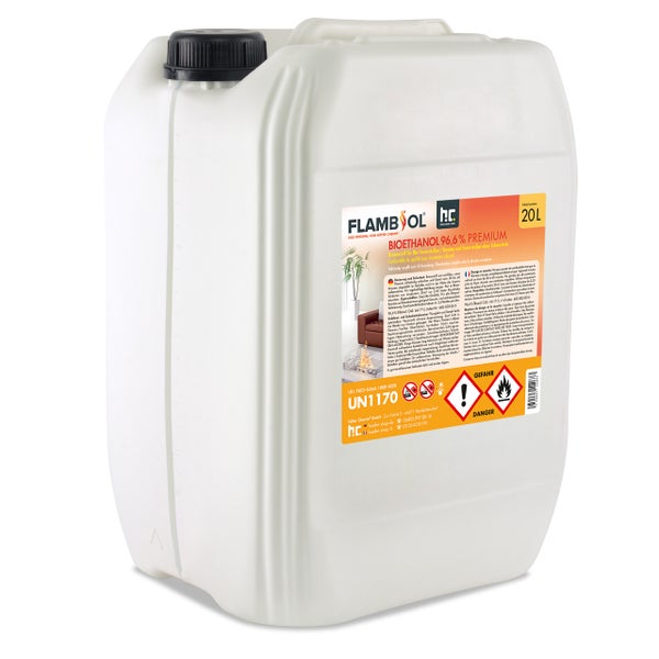 Entdecken Sie FLAMBIOL® Bioethanol 96,6% Premium im praktischen 20-Liter-Kanister – die ideale Lösung für Ihr Ethanol- oder Biokamin. Genießen Sie eine saubere, rußfreie Flamme, die eine gemütliche Atmosphäre schafft, ohne die Einschränkungen eines traditionellen Holzfeuers. Mit einem Ethanolgehalt von 96,6% garantiert unser hochwertiger Brennstoff eine sichere und effiziente Verbrennung, perfekt für den Innenbereich. Beachten Sie bitte die Sicherheitshinweise für den Umgang mit Bioethanol.