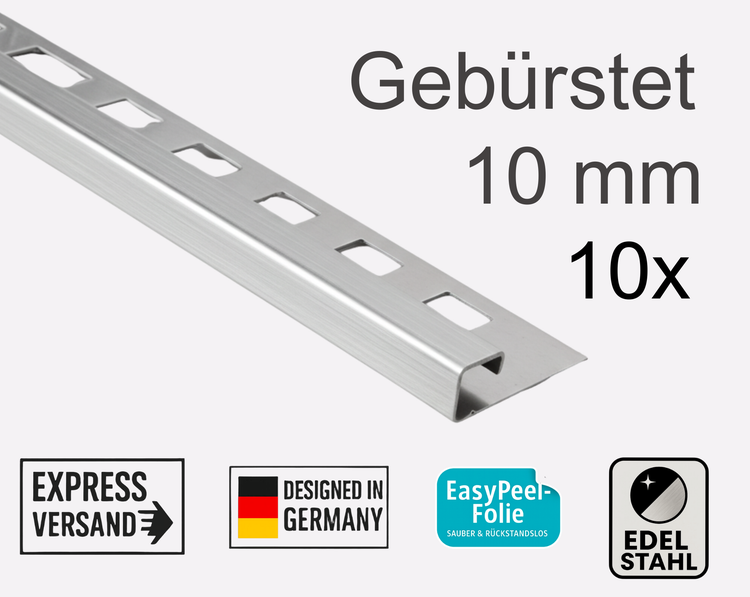 Quadrat Edelstahlschiene Fliesenschiene 10 mm im 10er Paket – hochwertige Abschlussprofile für Fliesen in Bad, Küche und Wohnbereich. Die rostfreie Edelstahlschiene schützt Kanten zuverlässig vor Beschädigungen und verleiht Fliesen ein modernes, professionelles Finish. Dank robuster Verarbeitung, präziser Passform und einfacher Montage ist die 10 mm Fliesenschiene ideal für Wand- und Bodenfliesen geeignet. Perfekt für langlebige, saubere und stilvolle Fliesenabschlüsse.