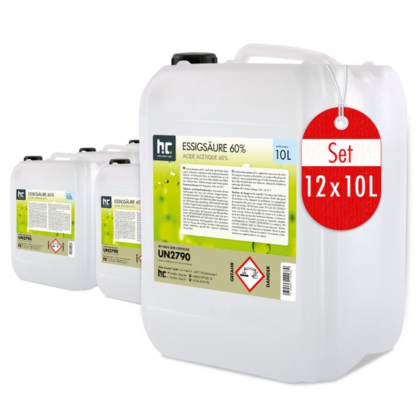 Entdecken Sie die vielseitigen Einsatzmöglichkeiten unserer 10 L Essigsäure mit 60% Säuregehalt. Ideal für Reinigung, Desinfektion und Entfernung von Fett, Kalk und Keimen. Diese umweltfreundliche Alternative zu herkömmlichen Reinigern ist biologisch abbaubar und enthält weniger schädliche Zusatzstoffe. Nutzen Sie sie auch zur Rostentfernung und als Weichspüler-Ersatz. Höfer Chemie steht für Qualität 'Made in Germany' und sorgt für Ihre Sicherheit.