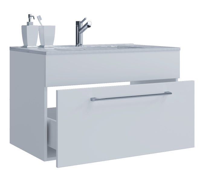 Das Badmöbel-Set besteht aus einem Unterschrank mit einer leichtgängigen Schublade mit Metallauszügen.