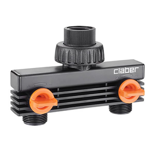 Mithilfe dieses Verteilers können Sie die Wasserzufuhr auf zwei Klickkupplungen verteilen. Die Kupplungen sind separat mit den beiden Hähnen absperrbar.