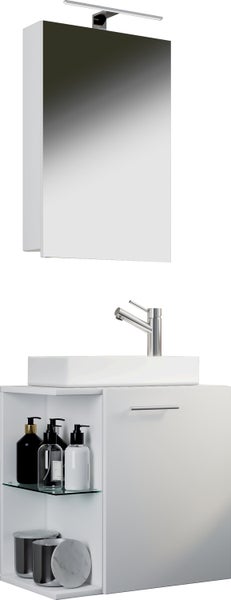Das elegante Set besteht aus einem Spiegelschrank sowie einem Waschbecken mit Waschbeckenunterschrank und bietet die perfekte Einrichtungslösung für WCs oder Gästetoiletten.