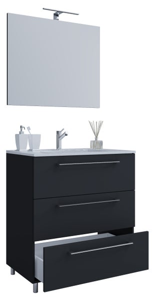 Das Badmöbel-Set besteht aus einem Unterschrank mit drei leichtgängigen Schubladen mit Metallauszügen.
