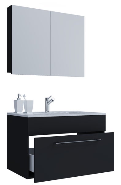 Das Badmöbel-Set besteht aus einem Unterschrank mit einer leichtgängigen Schublade mit Metallauszügen.