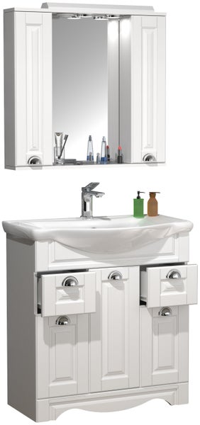Das VCM Badmöbel-Set Casalo besteht aus einem Unterschrank und einem Waschbecken aus massiver Keramik, sowie einem Spiegelschrank. Dem Designer ist mit dem Landhaus-Stil eine besondere Optik gelungen, was jedes Badezimmer in eine harmonische Wohlfühloase verwandelt.