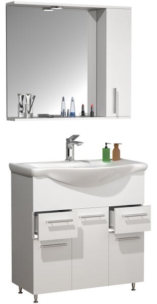 Der Designer hat sich bewusst für ein gewölbtes Waschbecken entschieden, da es den Komfort erhöht. Der Unterschrank hat drei große Drehtüren und zwei praktische Schubladen für viel Stauraum. Abrundet wird das Set mit einem Spiegelschrank, der weitere Stauraummöglichkeiten bietet.