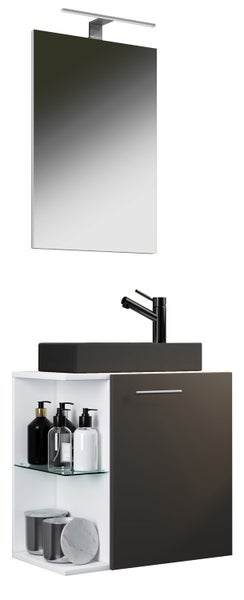 Das elegante Set besteht aus einem Spiegel sowie einem Waschbecken mit Waschbeckenunterschrank und bietet die perfekte Einrichtungslösung für WCs oder Gästetoiletten.
