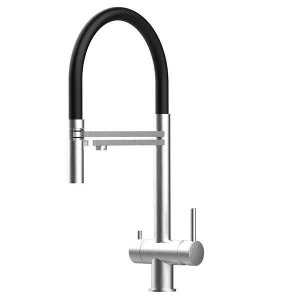 3 Wege Wasserhahn Küchenarmatur, Edelstahl Massiv mit 360° schwenkbarem Auslauf, abnehmbare 2 strahl Handbrause, Gebürstet / Schwarz