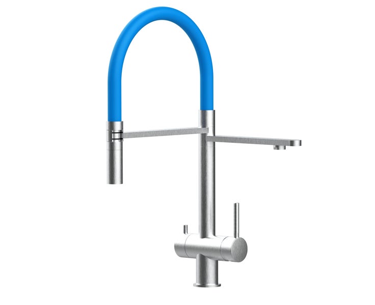3 Wege Wasserhahn Küchenarmatur, Edelstahl Massiv mit 360° schwenkbarem Auslauf, abnehmbare 2 strahl Handbrause, Gebürstet / Hellblau