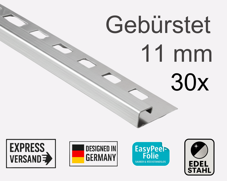 Quadrat Edelstahlschiene Fliesenschiene 11 mm im 30er Paket – hochwertige Abschlussprofile für Fliesen in Bad, Küche und Wohnbereich. Die rostfreie Edelstahlschiene schützt Kanten zuverlässig vor Beschädigungen und verleiht Fliesen ein modernes, professionelles Finish. Dank robuster Verarbeitung, präziser Passform und einfacher Montage ist die 11 mm Fliesenschiene ideal für Wand- und Bodenfliesen geeignet. Perfekt für langlebige, saubere und stilvolle Fliesenabschlüsse.