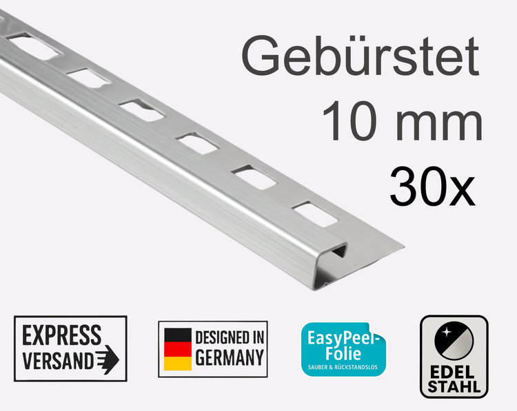 Quadrat Edelstahlschiene Fliesenschiene 10 mm im 30er Paket – hochwertige Abschlussprofile für Fliesen in Bad, Küche und Wohnbereich. Die rostfreie Edelstahlschiene schützt Kanten zuverlässig vor Beschädigungen und verleiht Fliesen ein modernes, professionelles Finish. Dank robuster Verarbeitung, präziser Passform und einfacher Montage ist die 10 mm Fliesenschiene ideal für Wand- und Bodenfliesen geeignet. Perfekt für langlebige, saubere und stilvolle Fliesenabschlüsse.