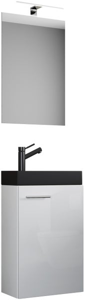 Das Set besteht aus einem Spiegelschrank und einem Waschbecken mit Waschbeckenunterschrank. Eine sehr elegante Einrichtungslösung für WCs oder Gästetoiletten, um ein optisches Highlight zu setzen.