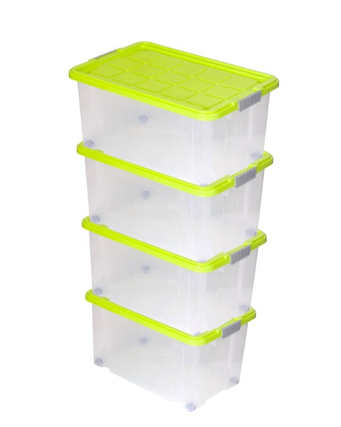 Unsere großen Plastikboxen sind stapelbar. Wenn Sie z.B. vieles im Keller weglagern müssen, können Sie einfach 4-5 Boxen stapeln. Da die Deckel extra Vertiefungen an der Stelle haben, wo die Räder zu finden sind, wird für eine extra gute Stabilität gesorgt, wenn man die Rollboxen stapelt