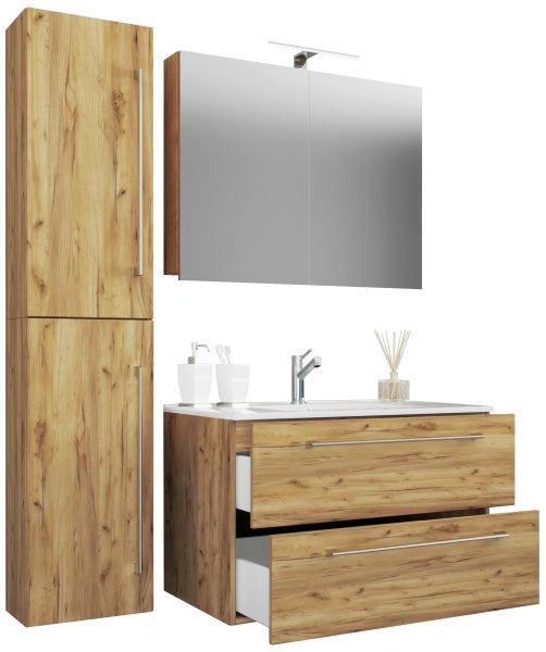- Artikel besteht ausHochschrank, Waschtisch, Waschtischunterschrank, Spiegel