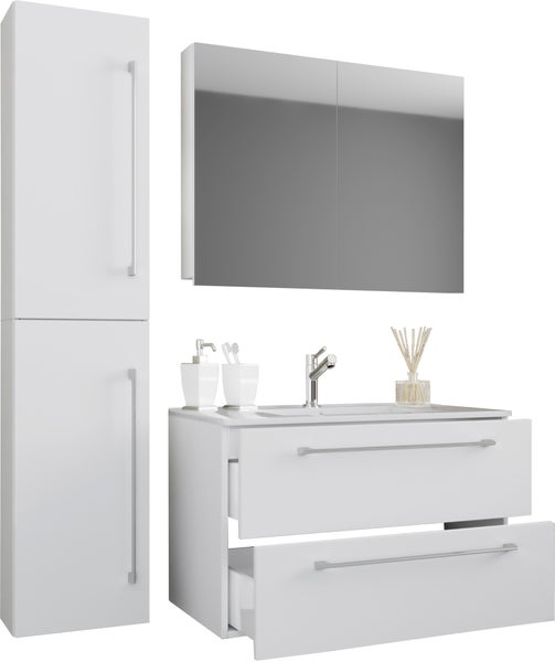 - Artikel besteht ausHochschrank, Waschtisch, Waschtischunterschrank, Spiegel