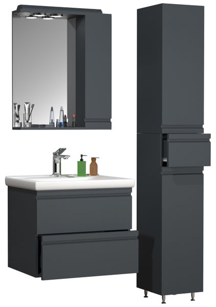 Das VCM Badmöbel-Set Silora besteht aus einem Unterschrank mit zwei Schubladen und einem Waschbecken aus massiver Keramik, sowie einem Spiegelschrank und einem Hochschrank.