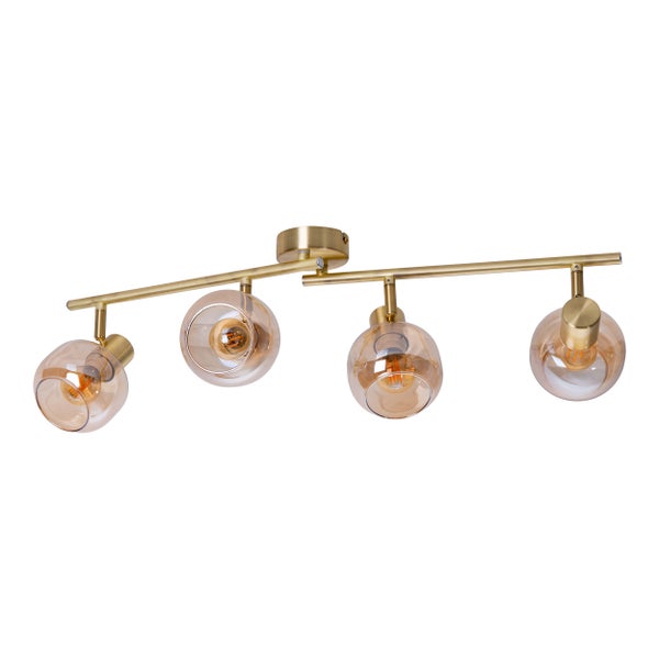 Der LIBBY Spot ist ein Schmuckstück für jeden Wohnraum. Durch gezielte Spot-Beleuchtung können bestimmte Bereiche oder Objekte geschickt in Szene gesetzt und eine bemerkenswerte Wirkung erzielt werden. Retro Style, Balkene Gestaltung und eine elegante Optik, optimal für alle, die es elegant und edel mögen! Die Leuchte aus Metall und Glas in messing ist ein Hingucker in jedem Raum.. Das Zusammenspiel von mattiertem Gestell und dem klar-transparenten Schirm verleiht dem Produkt ein harmonisches Gesamtbild. Der Spot misst 80 cm in der Länge, 10 cm in der Breite/Tiefe und 20 cm in der Höhe. Mit ihm erhalten Sie eine schöne Beleuchtungsmöglichkeit für Ihre Räumlichkeiten. Dank der E14 Fassung steht Ihne eine große Auswahl an Leuchtmitteln zur Verfügung. 4 der Fassungen sorgen für ausreichend Licht. Mit der Option, das Leuchtmittel selbst auszutauschen, sind Sie nicht nur unabhängig, sondern schonen auch Ihren Geldbeutel. Diese Leuchte entspricht der Klasse 1. Für den Netzbetrieb dieses Geräts wird eine Netzspannung von 220-240V ~ 50Hz benötigt. Die Leuchte verfügt über eine Gesamtleistung von 160 Watt. Unsere qualitativ hochwertigen Spots sorgen für das ideale Lichtambiente und verleihen Ihrem Zuhause Komfort und Stil in jedem Raum.