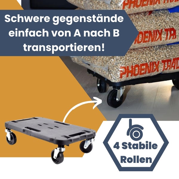 Natürlich kann und soll der Transportroller bewegt werden, jedoch muss der Untergrund ABSOLUT EBEN sein! Über Bordsteine oder Türschwellen, auf Kopfsteinpflaster, Waschbetonplatten, Schotter, Gras oder ähnlichem darf mit den Transportrollern bei gleichzeitiger Belastung nicht gefahren werden da andernfalls die Rollen brechen können! Ferner muss der zu transportierende Gegenstand das Rollbrett stets gleichmäßig und auf allen vier Rollen belasten.