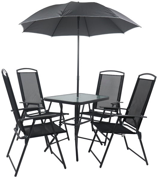 Die Möbel bestehen aus sehr hochwertigem Stahl und sind damit äußerst Wetter- und UV-beständig. Der robuste Tisch hat eine Platte aus Sicherheitsglas.