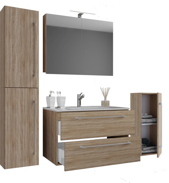 Das Badmöbel-Set besteht aus einem Hochschrank, einem Midischrank sowie einem Unterschrank mit zwei Schubladen auf robusten Meteallschienen und zwei Seitenschränken.