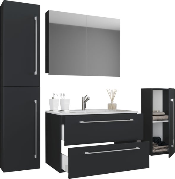 Das Badmöbel-Set besteht aus einem Hochschrank, einem Midischrank sowie einem Unterschrank mit zwei Schubladen auf robusten Meteallschienen und zwei Seitenschränken.