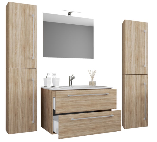 Das Badmöbel-Set besteht aus einem Unterschrank mit zwei Schubladen auf robusten Metallschienen.