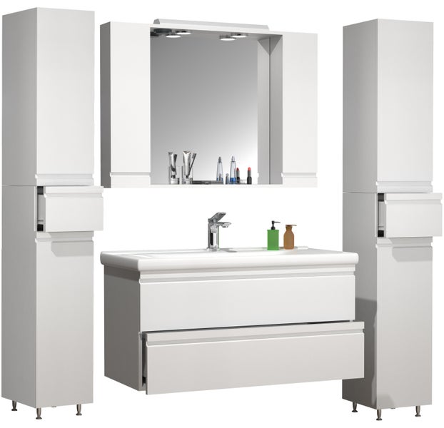 - Artikel besteht ausMidischrank, Spiegel, Waschtisch, Waschtischunterschrank, Hochschrank