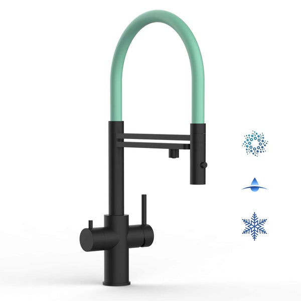 5 Wege Wasserhahn Küchenarmatur, Edelstahl Massiv mit 360° schwenkbarem Auslauf, abnehmbare 2 strahl Handbrause, PVD Schwarz Matt / Türkis