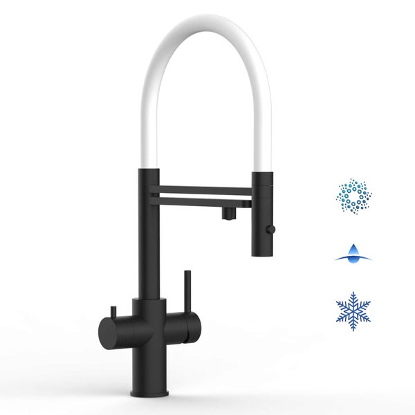 5-Wege-Wasserhahn Küchenarmatur Spültischmischer, massiv aus Chirurgen-Edelstahl, PVD Schwarz Matt, mit 360° schwenkbarem Auslauf und abnehmbare 2 strahl Handbrause - für alle Kombi-Kühl-, Filter- und Sprudelwassergeräte. Mit separater Multi-Selection-Keramik-Mischpatrone am Hahn und separatem Kanal für die gefilterte Wasserentnahme.