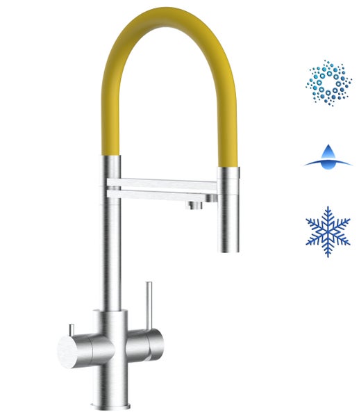 5-Wege-Wasserhahn Küchenarmatur Spültischmischer, massiv aus Chirurgen-Edelstahl, mit 360° schwenkbarem Auslauf und abnehmbare 2 strahl Handbrause - für alle Kombi-Kühl-, Filter- und Sprudelwassergeräte. Mit separater Multi-Selection-Keramik-Mischpatrone am Hahn und separatem Kanal für die gefilterte Wasserentnahme.