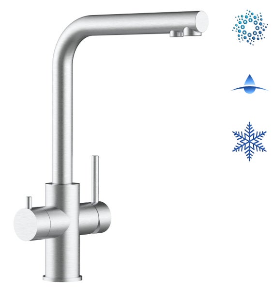 5-Wege-Wasserhahn Küchenarmatur Spültischmischer, massiv aus Chirurgen-Edelstahl, mit 360° schwenkbarem Auslauf - für alle Kombi-Kühl-, Filter- und Sprudelwassergeräte. Mit separater Multi-Selection-Keramik-Mischpatrone am Hahn und separatem Kanal für die gefilterte Wasserentnahme.