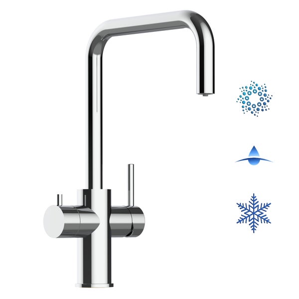 5-Wege-Wasserhahn Küchenarmatur Spültischmischer, massiv aus Chirurgen-Edelstahl, mit 360° schwenkbarem Auslauf - für alle Kombi-Kühl-, Filter- und Sprudelwassergeräte. Mit separater Multi-Selection-Keramik-Mischpatrone am Hahn und separatem Kanal für die gefilterte Wasserentnahme.