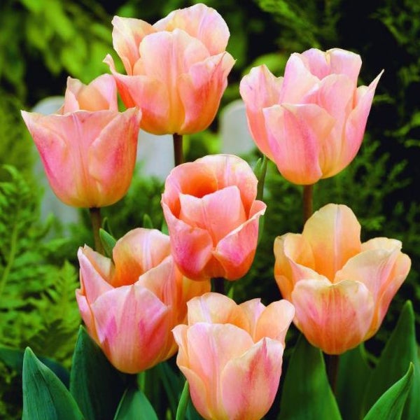 Bestellen Sie 50 x Tulpenzwiebeln 'Abricot Beauty'. Apricotfarbene Tulpen, die früh blühen und Ihrem Garten elegante Farbe verleihen.