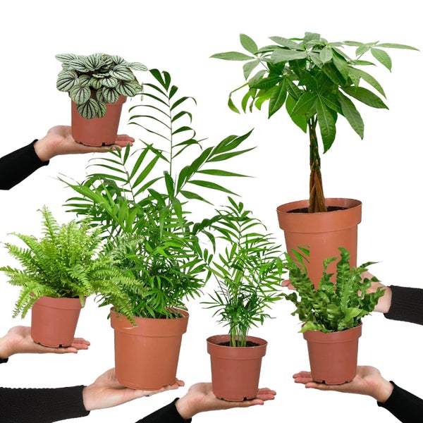 6er Box Zimmerpflanzen Happy Cat – Tierfreundliches Set mit Zwergpfeffer, Bergpalme, Nestfarn, Schwertfarn & Glückskastanie | Höhe 15-70 cm | Töpfe 10,5-17 cm | Green Me Up