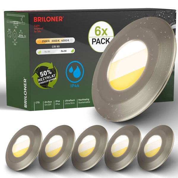 Diese Einbauspots sind mit einem Einbaurahmen aus 50% recyceltem Kunststoff in Matt-Nickel gefertigt und bieten eine umweltfreundliche Beleuchtungslösung, ideal für umweltbewusste Verbraucher.
