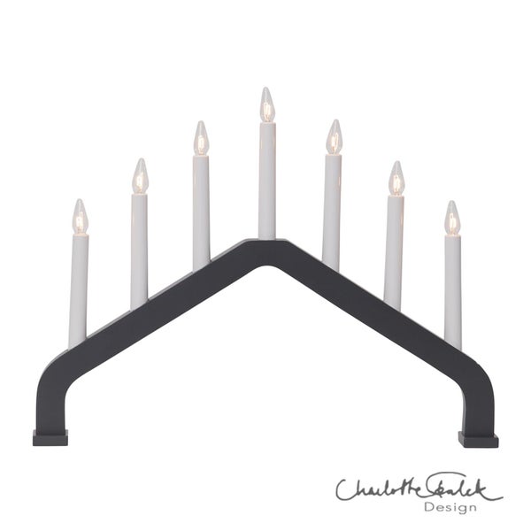 - Der Lichterbogen besteht aus dunkelgrau lackiertem Holz, welcher mit sieben weißen Kerzen bestückt ist