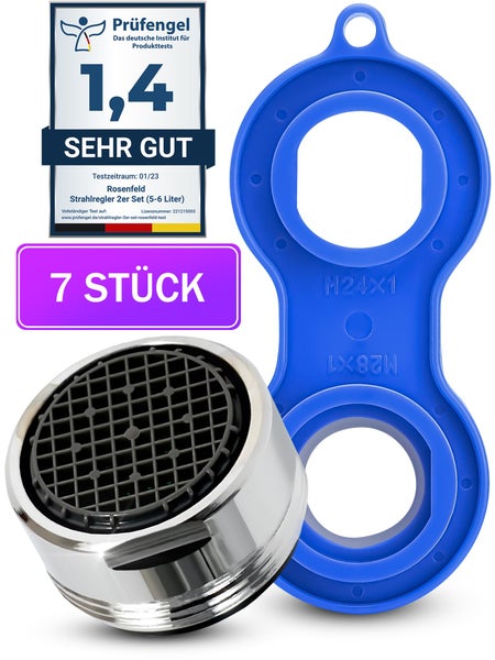7 Stk. Sehr Wassersparend Strahlregler M24 Wasserfluss 5 l/min mit Montageschlüssel - High Tech Anti Kalk Wasserhahn Strahlregler mit Kugelförmige Filter - Aufsatz Strahlregler für Wasserhähne