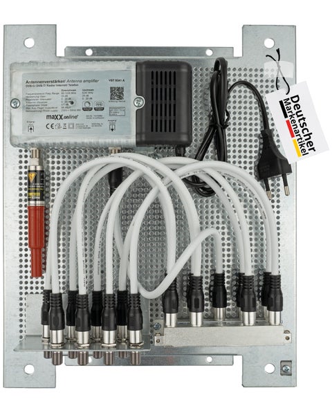 8 Teilnehmer Set mit Antennenverstärker für Kabelfernsehen 33 dB Verstärkung & Rückkanal, Kabel Verteiler, Überspannungsschutz, F-Verbindungskabel vormontiert auf Lochblech Montageplatte