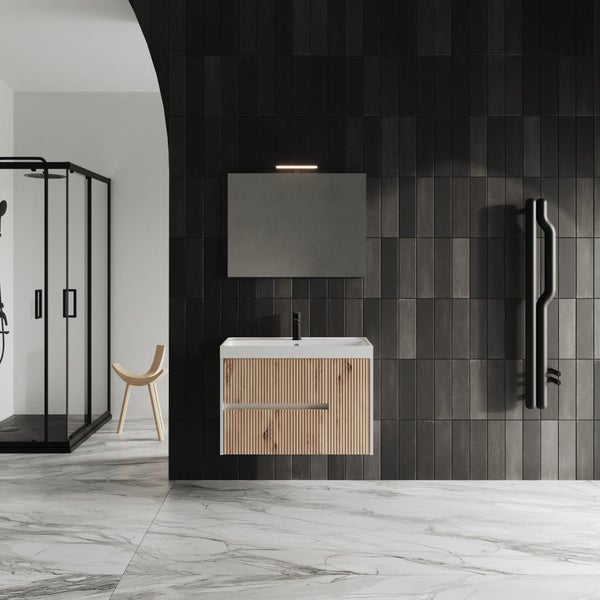 80 cm Badmöbel- Set in goldeiche geriffelt mit Spiegel | Cortina