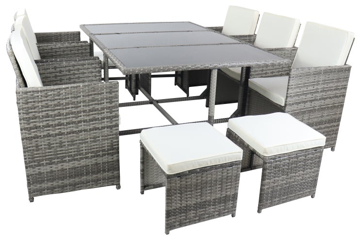 - Set bestehend aus 1 Gartentisch, 6 Stühlen, 2 Hockern, Sitzpolstern