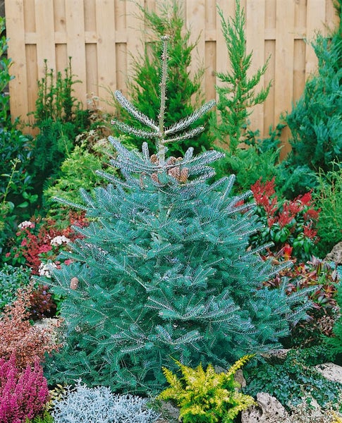 Als Zwergkonifere und Ziergehölz macht die Koreanische Tanne auch in Kübeln auf Terrasse und Balkon eine ausgezeichnete Figur, wo sie als strukturstarkes Element ganzjährig wirkt. In Gruppenpflanzungen mit Rhododendren, Heide, Ziergräsern und anderen immergrünen Koniferen setzt sie ruhige, edle Akzente; im Steingarten oder im alpinen Beet fügt sie sich harmonisch ein. Bevorzugt werden sonnige bis halbschattige Standorte mit humosem, leicht saurem, gleichmäßig frischem, gut durchlässigem Boden. Staunässe sollte vermieden werden, eine Abdeckung mit Rindenmulch hält die Feuchtigkeit und schont die flachen Wurzeln. Schnitt ist kaum nötig; allenfalls leichte Korrekturen nach dem Austrieb sind sinnvoll. Gleichmäßiges Gießen in Trockenphasen und ein moderater, koniferengerechter Dünger im Frühjahr unterstützen den dichten, gesunden Wuchs und die Bildung der zierenden Zapfen.
