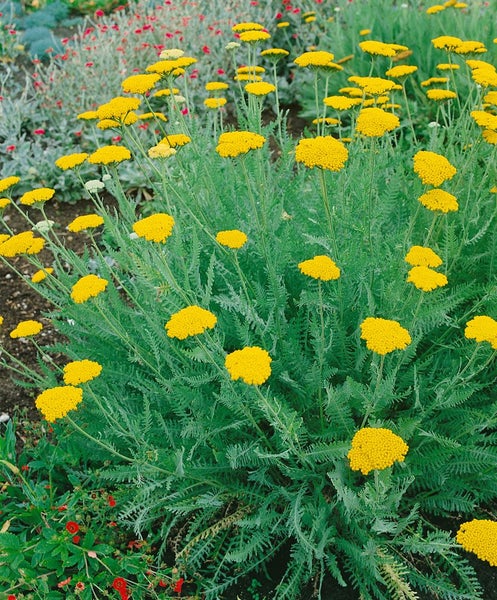 Achillea clypeolata, die Schild-Schafgarbe, ist eine robuste, trockenheitsverträgliche Staude mit silbrig-grauem, fein gefiedertem Laub und leuchtend gelben, tellerförmigen Blütendolden. Diese charakterstarke Beetstaude zeigt ihre dichte, flachkuppige Blütenpracht zuverlässig von Juni bis August und bildet kompakte, horstige Polster, die im Beet ebenso wie im Steingarten oder Kiesgarten eine klare Struktur schaffen. Der niedrige, standfeste Wuchs von etwa 25 bis 40 Zentimetern und die attraktive Blattfarbe machen sie zu einer idealen Akzentpflanze im Vordergrund von Staudenbeeten, als langlebige Steingartenstaude und als pflegeleichte Kübelpflanze auf Terrasse oder Balkon. In Gruppenpflanzung entfaltet sich ein harmonisches Bild, doch auch als kleiner Solitär setzt sie markante Punkte im Vorgarten oder im mediterranen Trockenbeet.