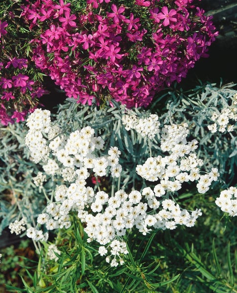 Achillea x kellereri, die edel wirkende Schafgarbe, ist eine kompakt wachsende Zierstaude mit silbrig-grauem, fein gefiedertem Laub, das bereits außerhalb der Blütezeit für attraktiven Strukturwert sorgt. Von Juni bis in den Spätsommer erscheinen flache, doldenartige Blütenstände in reinem Weiß bis Cremeweiß, die über dem polsterbildenden, horstigen Wuchs schweben und Beeten, Steingärten und Rabatten eine helle, elegante Note verleihen. Die Gartenstaude bleibt meist niedrig bis mittelhoch, bleibt standfest und bringt in Gruppenpflanzung ebenso Wirkung wie als dezenter Solitär im Vordergrund sonniger Beete. Als Steingartenpflanze und für Präriebeete geschätzt, passt sie hervorragend in den Vorgarten, an Wegeinfassungen und in naturhafte Pflanzungen; in größeren Töpfen oder Trögen macht sie auch als Kübelpflanze auf Terrasse und Dachgarten eine gute Figur. Achillea x kellereri bevorzugt vollsonnige Lagen mit durchlässigem, eher magerem, sandig-kiesigem Substrat und ist ausgesprochen trockenheitsverträglich, hitzeresistent und winterhart; Staunässe sollte vermieden werden, besonders im Winter. Ein leichter Rückschnitt nach der Hauptblüte fördert eine saubere Erscheinung und kann eine Nachblüte anregen, zudem eignet sich der Blütenflor als haltbare Schnittblume und für Trockensträuße. Harmonische Pflanzpartner sind zarte Ziergräser, Lavendel, Salvia und Nepeta, die die silbrigen Blätter und die hellen Blütenteller formschön begleiten. Mit ihrer pflegeleichten Art, der kompakten Wuchsform und der langen Blütezeit ist diese Schafgarbe eine vielseitige Beetstaude für sonnige Gartenbereiche.