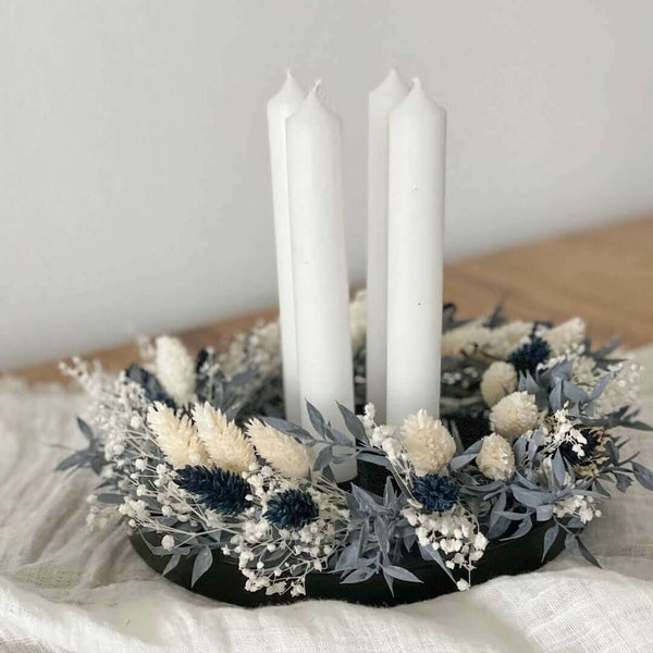 Dieser wunderschönen Adventskränze aus Trockenblumen in klein sind die perfekte Ergänzung für das magnetische Kerzentablett zur Adventszeit. Das Kerzentablett kann durch die magnetischen Kerzenhalter vielfältig eingesetzt werden und ist das ganze Jahr ein Highlight egal ob als Tablett oder Adventskranz. Elegant und minimalistisch in reduzierten Farben. Ob als Geschenk, an der Tür oder an der Wand - der schlichte Kranz sieht überall super aus!