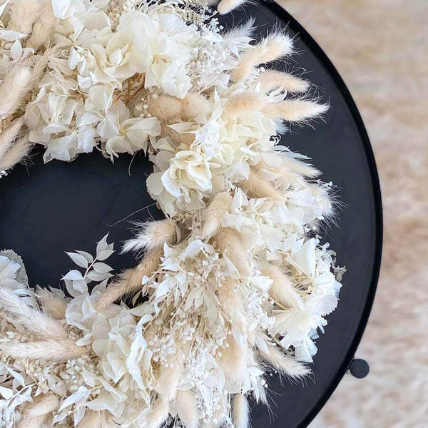 Dieser opulente Premium Trockenblumen Adventskranz ist ein absolutes Unikat, handgefertigt mit den wertigsten Trockenblumen die wir im Sortiment führen. Der Kranz ist mehr als nur ein regulärer Adventskranz, denn durch die üppigen Trockenblumen, wie hochwertige weiße Hortensien, Schleierkraut, Ruskus und co. wird jeder der ihn sieht fasziniert innehalten und staunen.