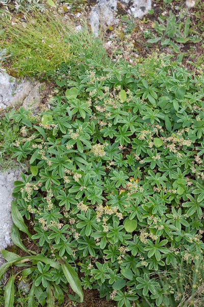 Alchemilla faeroensis var. pumila, der zierliche Zwerg-Frauenmantel, ist eine kompakte Staude mit ausgesprochen dekorativem, fächerförmigem Laub und feinen, gelbgrünen Blütenrispen. Die rundlich gelappten, weich anmutenden Blätter sammeln Tautropfen und bilden dichte, polsterartige Horste, die den Garten vom Frühling bis in den Herbst strukturell bereichern. Von späten Frühlingstagen bis in den Hochsommer erscheinen zarte, schwebende Blüten in limonen- bis schwefelgelber Tönung, die über dem frischen Blattwerk stehen und den Polstercharakter elegant unterstreichen. Der Wuchs bleibt niedrig und gleichmäßig, ideal als Bodendecker, für die Beetränderung und als Polsterstaude im Vordergrund von Staudenbeeten.
