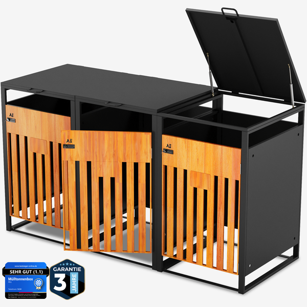 ALL Premium Mülltonnenbox 3er – Abschließbar, wetterfest & edle Holzoptik, für Garten, Hof & Straße, beliebig erweiterbar, legierter Stahl robust & langlebig