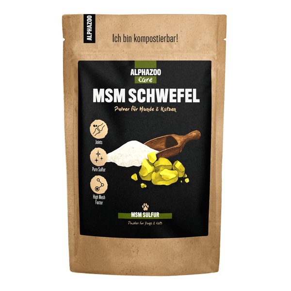 Alphazoo MSM Schwefel-Pulver, für Hunde Katzen Pferde Gelenke, 99,9% Rein, organische Methylsulfonylmethan Kristalle hochdosiert, Gelenkpulver ohne Zusätze, Vegan, Mesh-Faktor 40-80, Nachhaltig. MSM steht für Methylsulfonylmethan und ist eine organische Schwefelverbindung, die Knochen, Bänder und Sehnen für ihre Vorgänge brauchen. Ein Mangel an Schwefel kann für Gelenkschmerzen, Darmerkrankungen oder Haarausfall sorgen. Unser MSM-Pulver ist zu 99,9% hochrein und die Herstellung erfolgt nach einem aufwändigen Destillationsverfahren, wodurch die feinkörnige, kristalline und wasserlösliche Struktur erhalten bleibt. Auch für starke Hufhörner.