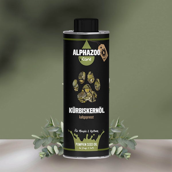 Kürbiskernöl für Hunde & Katzen, Barföl für die Hunde Verdauung, reich an Vitaminen & Mineralstoffen, kaltgepresstes und naturbelassenes Futteröl für Hunde mit Linolsäure. Alphazoo Kürbiskernöl fördert dank des besonders hohen Anteils an essentiellen Fettsäuren das Wohlbefinden von Hund und Katze. Außerdem wird die Verdauung des Tieres unterstützt. Unser veganes Kürbiskernöl spendet Energie dank gerösteter Kürbiskerne und eignet sich hierdurch auch als perfekte Futterergänzung für eine vegetarische und vegane Fütterung. Kaltpressung sichert alle Nährstoffe für deinen Vierbeiner. Unser Kürbiskernöl ist bekannt für einen spektakulären Gehalt an Vitaminen, Mineralstoffen, Magnesium und Kalzium.