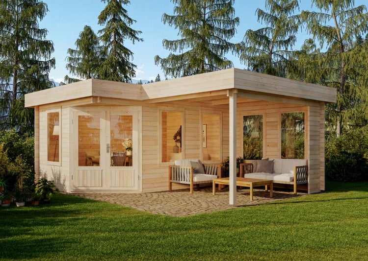 Alpholz 5-Eck Gartenhaus Leelo-40 mit Anbau Gartenhaus aus Holz, Holzhaus mit 40 mm Wandstärke inklusive Schleppdach Blockbohlenhaus, Naturbelassen